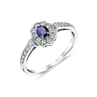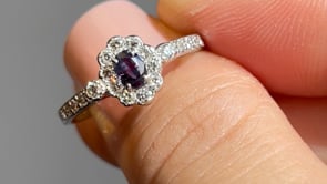 This classic design features a 0.26ct natural alexandrite surrounded by sparkling diamonds. This is a great design for someone who is traditional and enjoys timeless elegance. Perfect for an engagement ring or a special occasion.