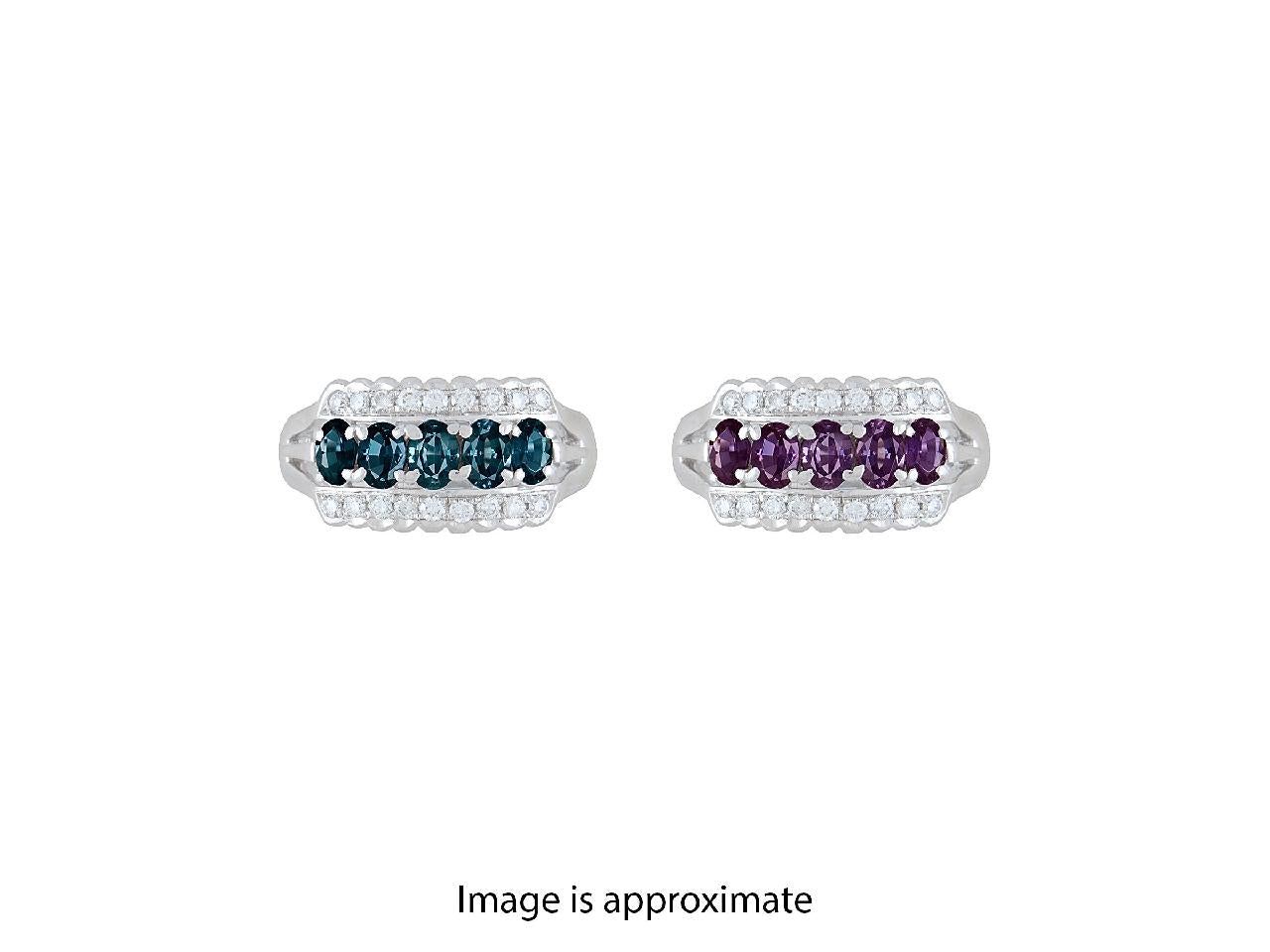At its heart, five natural alexandrites of exceptional quality display one of the most captivating phenomena in the gem world: a dramatic color change from greenish-blue in daylight to rich purple under incandescent light. This seamless transformation gives the ring a dynamic presence—ever-changing, yet timeless.