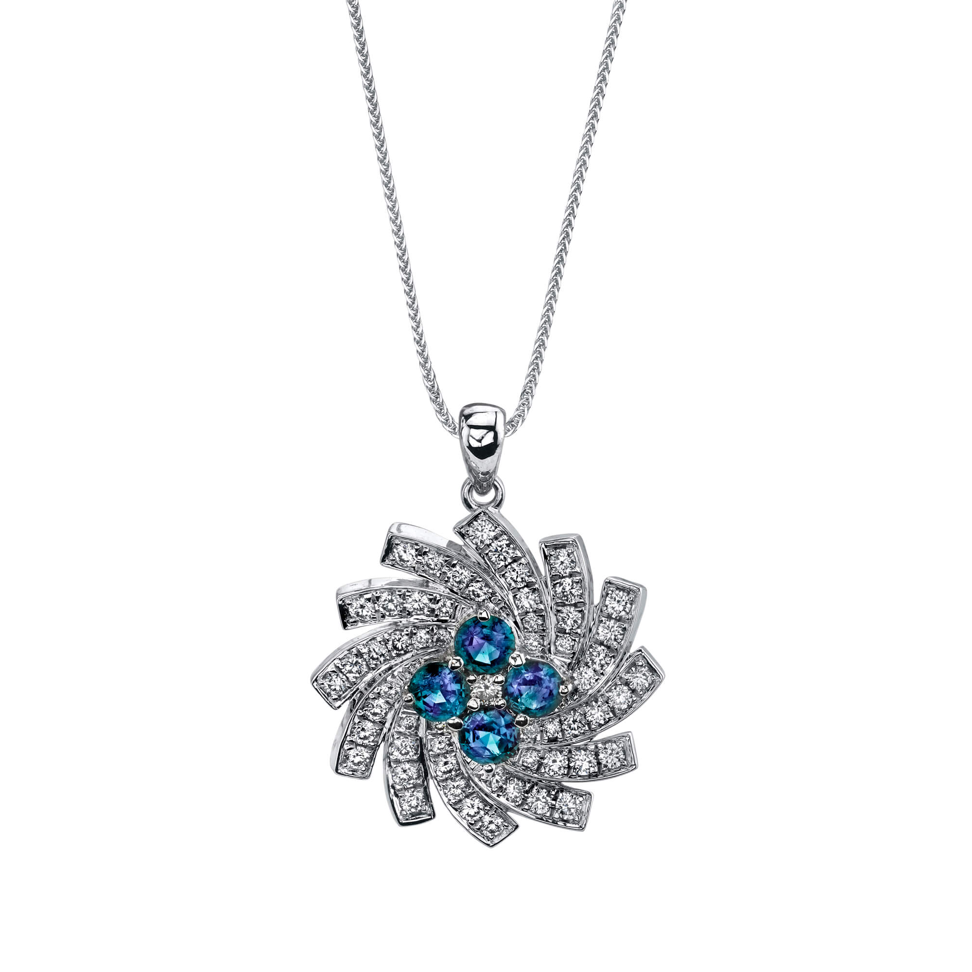The vivid colours of this bluish-green Alexandrite echo the natural beauty of a the ocean in this striking and contemporary pendant design. A wonderfully elaborate way to treat the love of your life the pendant is surrounded by bright shining Diamonds which catch the light with every turn.