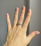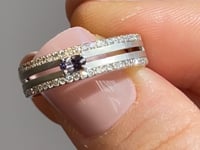 This brand new design features a combination of brushed platinum where the 0.15ct alexandrite is nestled between two rows of diamonds. This affordable piece is great for everyday wear promoting a trendy look.