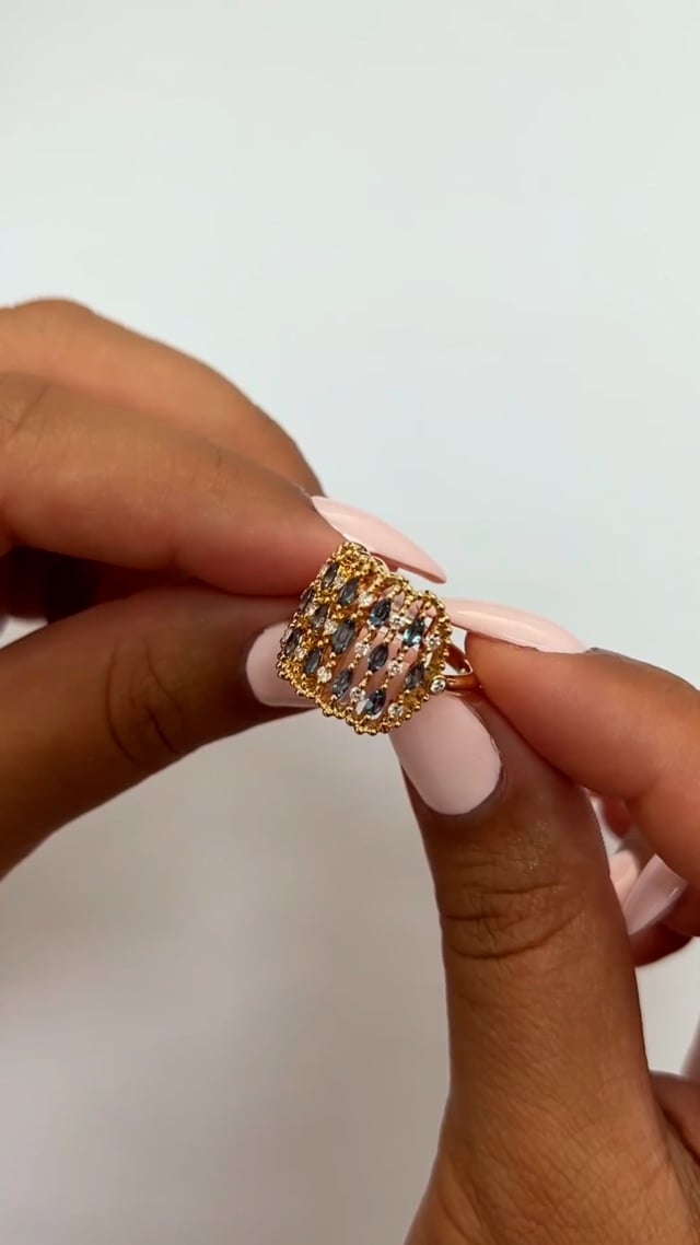 From our Magical ring series comes our Magical Garden ring. Featuring an array of beautifully cut natural marquise shaped alexandrites sewn together between sparkly diamonds and 18K Yellow Gold, this is truly a unique piece. This is one of those rings that once sold may take time to remake due to the intricate nature of the design.