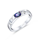 This platinum band features a 0.46ct natural alexandrite bezel set in a unique design featuring alternative baguette diamonds on the shank. A contemporary look.
