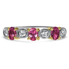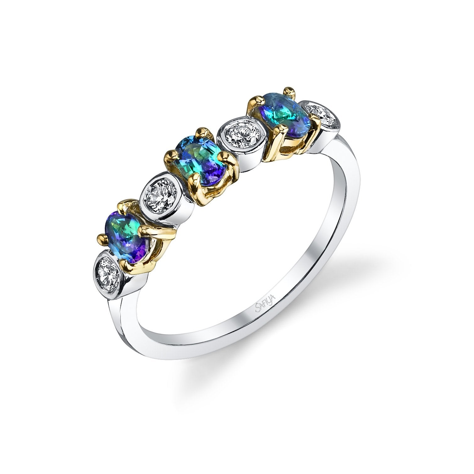 Crown your finger with this glam Admirable ring from Safiya. Showcasing three brilliant natural Alexandrite stones held by Yellow Gold claws to enlarge the look of Alexandrites, the Diamonds set in an alternate pattern brings subtle glamor to the ring. The combination of Gold, Alexandrite and Diamond adds boost of elegance to your daily look.