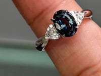 Set in Platinum (Pt900), the Alexandrite is flanked by a pair of precision-cut natural trillion diamonds, carefully chosen to enhance the center stone without overpowering it. The diamonds frame the Alexandrite with subtle brilliance, while the polished platinum setting provides a timeless, modern silhouette that feels both elegant and enduring.
